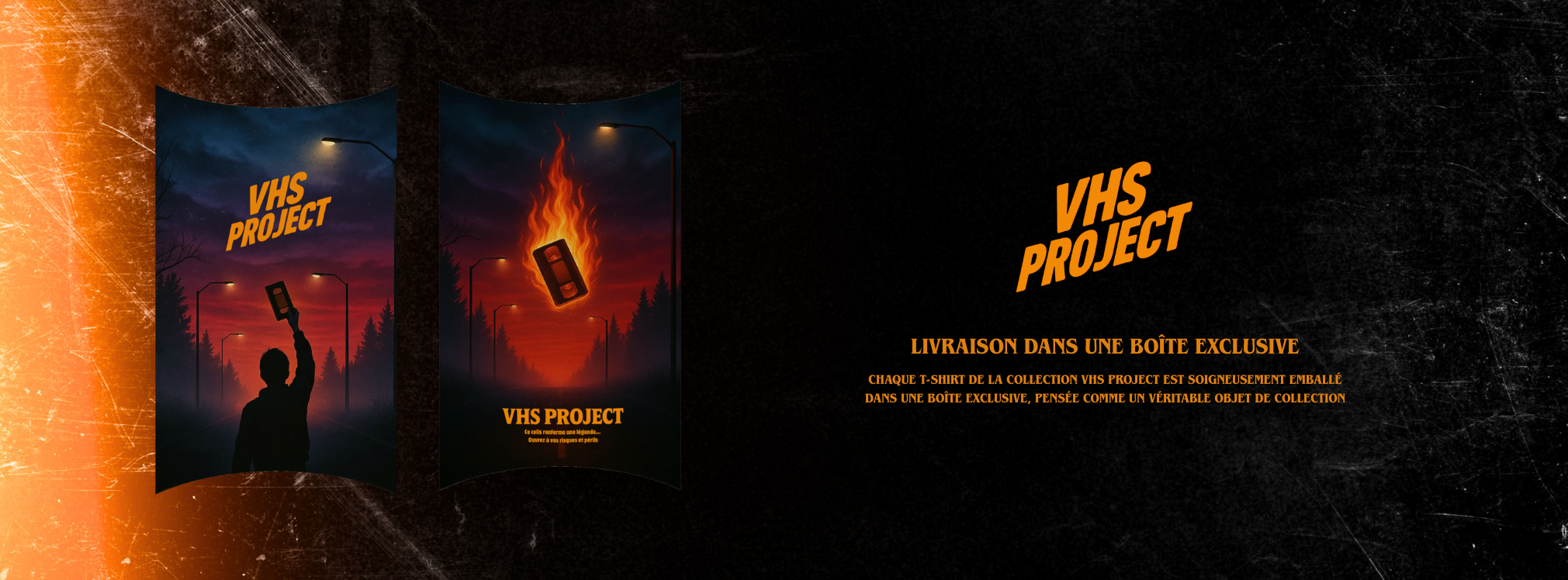 Chaque t-shirt de la collection VHS Project est soigneusement emballé dans une boîte exclusive, pensée comme un véritable objet de collection. Plus qu’un simple emballage, c’est une partie intégrante de l’expérience : un design unique qui reflète l’univers rétro et mystérieux du projet.